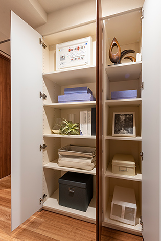 かさばる書類や普段使わない日用品・雑貨類など、収納する物の大きさに応じて棚の位置が変更できる機能的な収納スペースです。