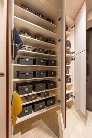 収納力のあるシューズボックスを設置。 小物をかけるフックや傘立スペースもあります。また、棚板を外せば、ベビーカーを置くこともできます。