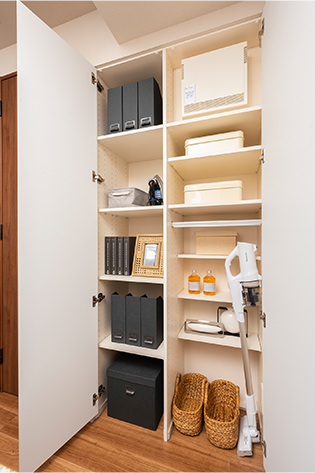 掃除用具や普段使うものをすぐに取り出せるスペースとして、ダイニング・キッチン、リビング・ダイニングなどプランに合わせて随所に設置しました。