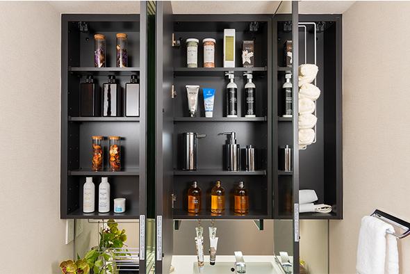 三面鏡の裏には、洗面用具などを機能的に収納できるスペースを設けました。小物をすっきりと収納でき、洗面室のスペースを整えます。