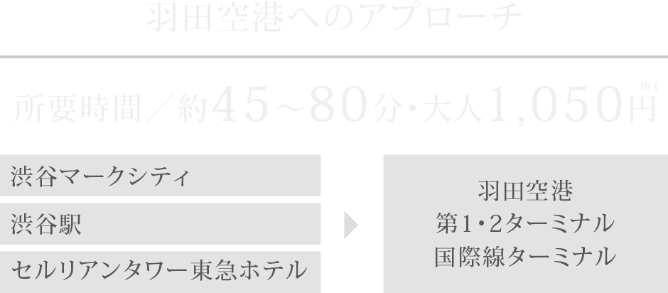 徒歩3分の「セルリアンタワー東急ホテル」からは、羽田空港・成田空港への空港連絡バスが運行。