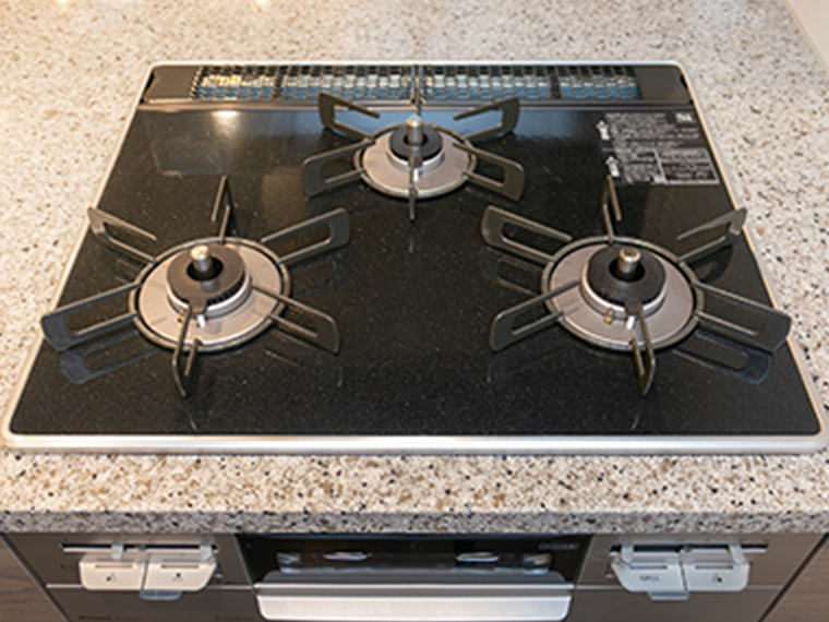 - 熱や衝撃に強く、お手入れ簡単なパールクリスタルトップの3口コンロ(2LDK、1LDKに採用)。※35A・35B・35C・35D・35E・35Fを除く