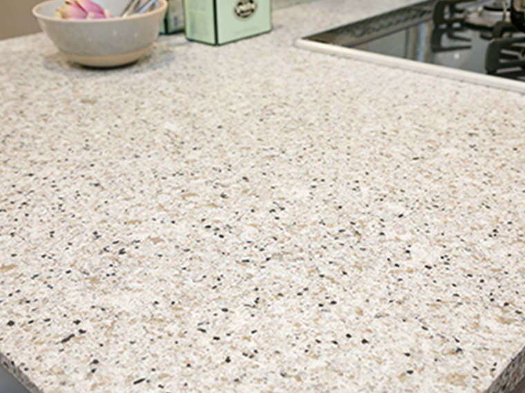 - 高純度の水晶を含有したフィオレストーンを採用しました。硬度が高い為、傷つきにくく汚れが染み込みにくい素材です。