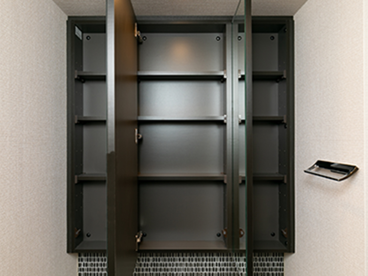 - 三面鏡の裏には、洗面用具などを機能的に収納できるスペースを設けました。