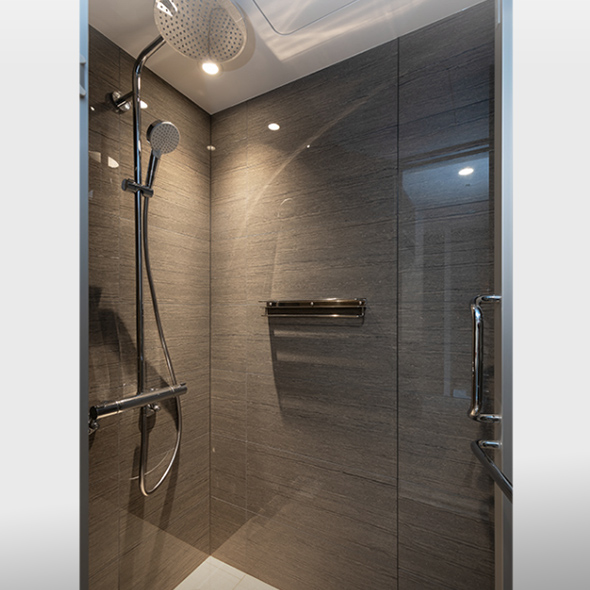 土間プランでは、浴槽をなくしその分の生活スペースを創出できる、全面タイル貼りのシャワーユニット「Roomot Luxwer」を採用し、アウトドアなライフスタイルに対応するための、豊富な収納スペースを確保しました。