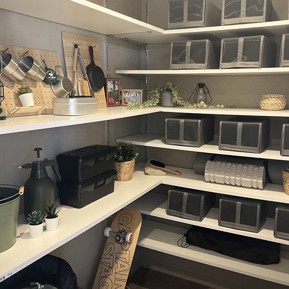キャンプ用品、スノーボード、自転車、ゴルフバッグなど、趣味の道具を収納しやすい土間を玄関スペースに設けたプランを用意いたしました。好きなものをディスプレイできる有孔ボードの壁や、アウターや濡れた服を掛けられるハンガーパイプを設置した空間になっており、それぞれの用途にあわせてお使いいただけます。