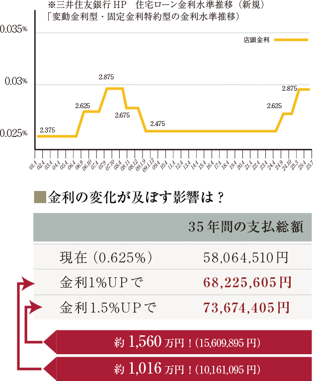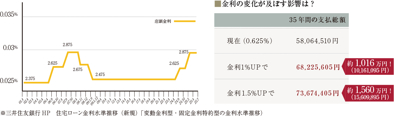 契約時に低金利だったとしても、建物完成までの期間が長い場合、金利が上がって当初の資金計画とズレが出る場合も。