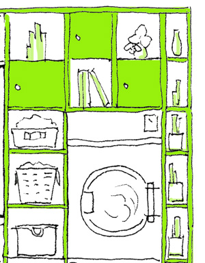 エレベータ脇の空間を利用してみました。共有の洗濯乾燥機と言っても、一階や地下まで降りていくのはおっくうなもの。この絵のようにフロアごとに1〜2台、最小限置くというのはどうでしょうか。普段は扉を閉めておきますが、使う時には扉を開いて使います。エレベータの近くという事で、待っている間にご近所の方とのコミュニケーションもおきやすいかもしれません。