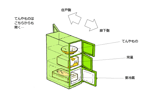今回はそんなことを解決するために、玄関脇の宅配や食配を受け取るボックスを考えてみました。外から見ても乱雑に見えないように、そしてものが廊下の共有スペースにはみ出さないように、あらかじめボックスがあればその中にしまっておくことができます。天屋ものの器などもこの中に置いておけば、見た目にも目障りではありませんね。