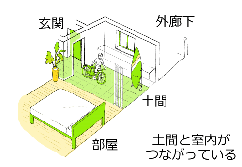この間取りでは、お風呂を南側のテラスに近いところに配置しています。海が目の前にあるこのマンションでは、窓を開け放し、海の音を聞きながらお湯につかって過ごしたり、お風呂上がりにバルコニーでビールを飲んだりと、今までの商品開発の考え方ではできなかったことを実現させています。また玄関から入ると、部屋に続く土間が用意されていて、ここにはサーフボードや自転車を置いたりと、自分の好きな趣味の空間が広がります。自分の一番好きなことを中心に暮らしを考えてみる。そんなことがこのマンションでは実現できるのです。