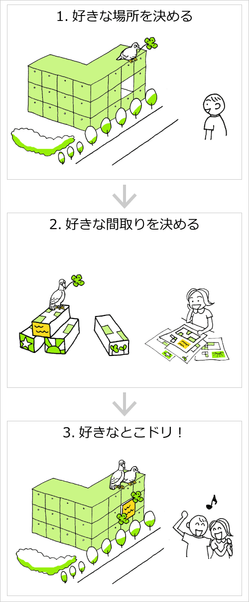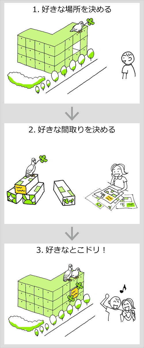 これまでのマンションは、上下階の水廻りが同じ位置でなければならなかったため、間取りの自由度が少ないものでした。このマンションは床下に十分な配管スペースが確保されていて、水廻りの位置まで自由に変えられるようになりました。通常は、気に入った住戸が、気に入った間取りでないことがよくあります。これまでのマンション購入は、場所と間取りのどちらかを優先させなければならなかったのです。しかしこのマンションは、自分の欲しい場所を価格と比較して選ぶことで、あとはあらかじめ用意されている豊富なメニュープランから、好きな間取りを選ぶ事ができます。また用意されている間取りも、今までのような一般的な間取りにこだわる事なく、思い切ったプランを現実のものとすることが可能なので、大胆な間取りも用意する事ができました。こうした仕組みを私たちは「スマート スタイル セレクト」と名付けました。