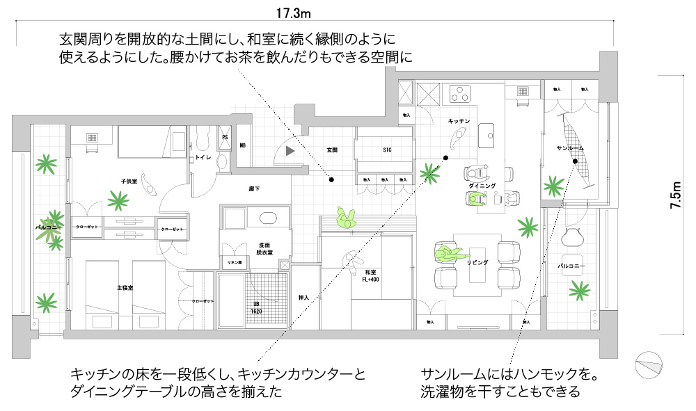 家族があつまる場所は仕切りを無くし、家族のつながりをゆるやかに形成させる空間にしています。元々はハーブテラスだったスペースはサンルームに。晴れた日は洗濯物を干したり、くつろいだりできる場所としました。また、キッチンとの仕切りを開放することでキッチンにも自然光を取り入れることができ、明るいスペースで調理を楽しめるようになっています。キッチンは思い切って玄関からSIC(シューズインクローゼット)をはさんで土間続きに。リビングとの段差(段差150mm)を利用してキッチン(カウンター高さ850mm)とダイニングテーブル(天板高さ700mm)の高さを同じにして空間の連続性を高めています。