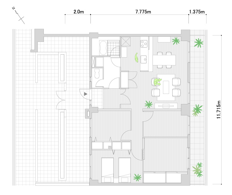 バスルームは、インナーテラスを挟んでバルコニー側に配置してみました。外の景色を眺めながらの入浴は、癒しのひと時となると思います。