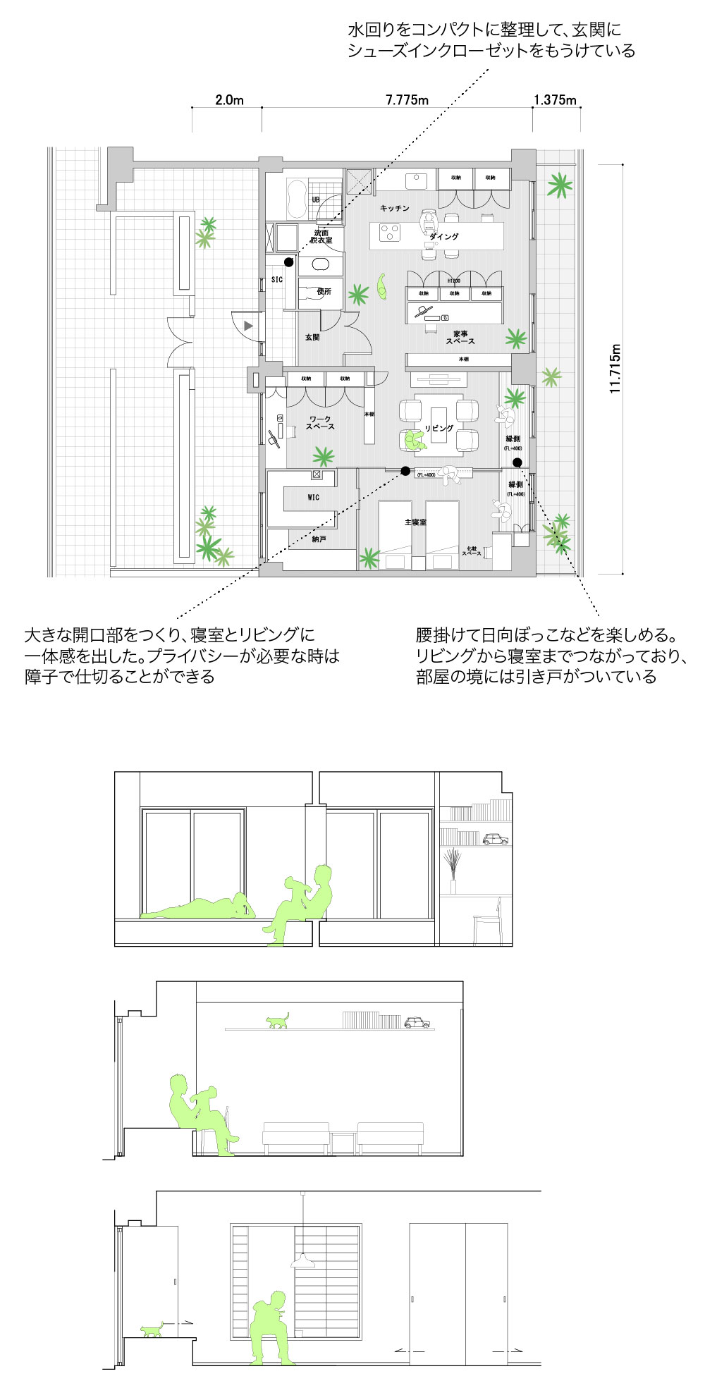 玄関側の土間は趣味を楽しむことができるホビースペースにしてみました。マンションの周りの自然や美味しい料理を写真におさめ、ホビースペースで編集・加工をして、自慢の写真をギャラリーに飾ることもできます。また、ゲストスペースでは写真を眺めながら、隣接するコンパクトなキッチンで食事をつくることもできますし、好きなお酒を並べて、バーカウンターとして使うのも楽しいでしょう。(キッチンは、マンションの1階にレストランがあるとのことでしたので、シンプルなタイプを考えてみました。)
