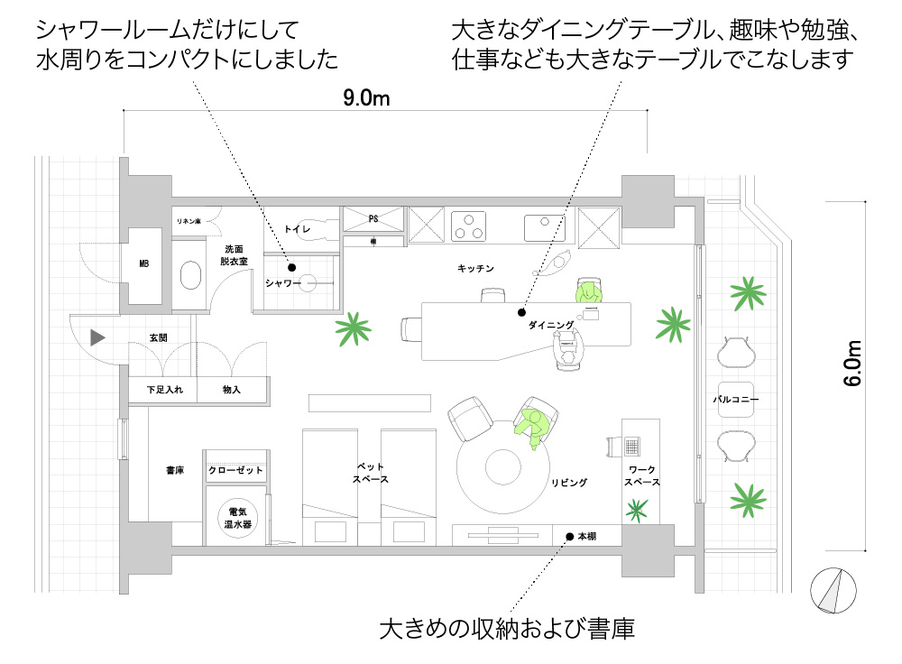 一人で行くという想定はどうでしょうか。毎日のハードワーク、週末は仕事をはなれてゆっくりとした時間を過ごすためのプランです。これからのことややりたかった勉強など、いつもと違う環境で他のことに取り組むのはどうでしょうか。趣味のサーフィンや釣りをするのもいいでしょう。たまには奥様や友人を招くのもよいでしょう。この提案ではワークデスクや書類棚もおいていますが、大きなダイニングテーブルでも料理を楽しんだり仕事もしたり、たまには友人と語らったりもできるでしょう。このマンションには温泉があるとのことなので、バスタブをやめてシャワーだけにしてみました。水周りがコンパクトになった分、その他のスペースを広くしてみました。