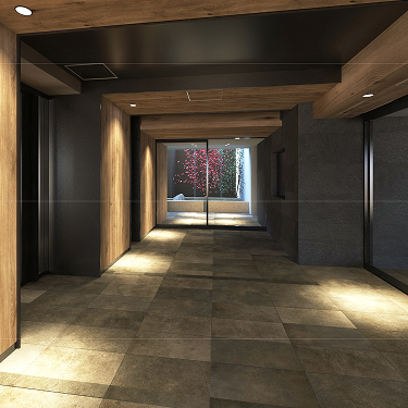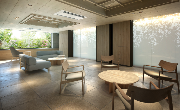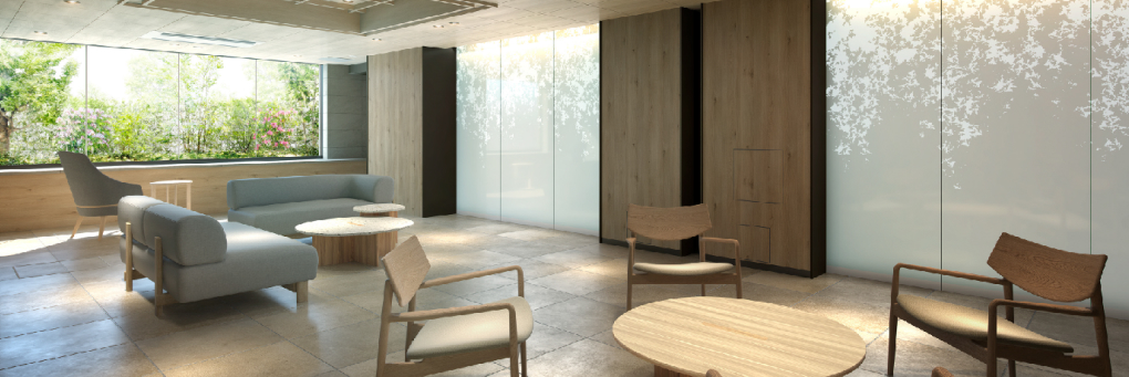 ソファーやテーブルなどを配したラウンジの一画に亀戸ならではの伝統工芸を用いた工芸作品を設えて空間を美しく演出します。
