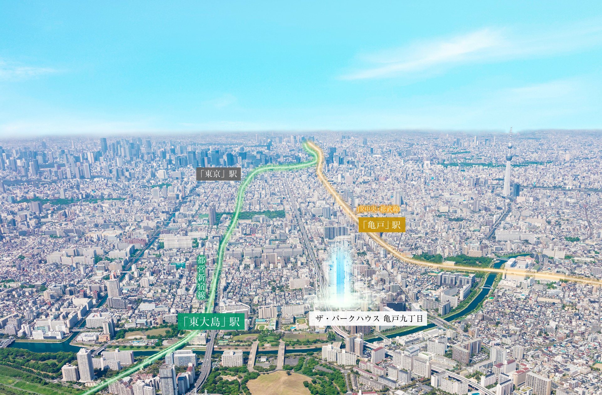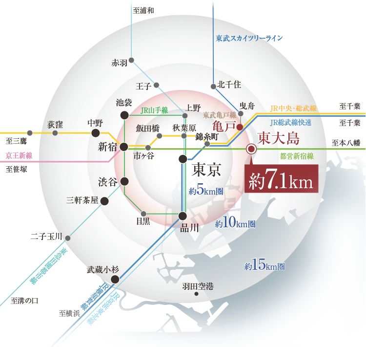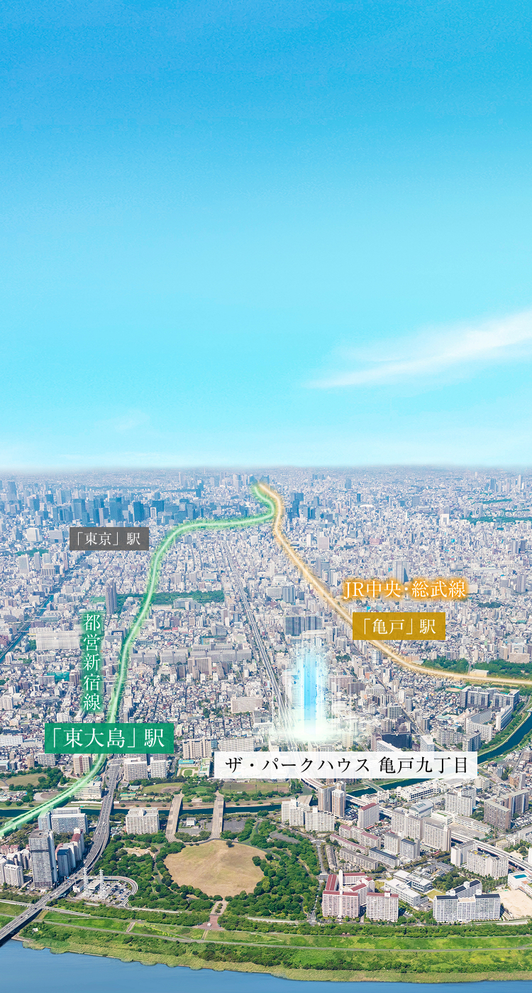 「東大島」駅は「東京」駅からおよそ7. 1k m圏に位置しており、渋谷や池袋などと同距離圏です。都心への軽快なアクセスと高い利便性、さらに荒川の潤いや大島小松川公園の緑景に寄り添い、都市の躍動と自然のやすらぎが共存する住環境が形成されています。