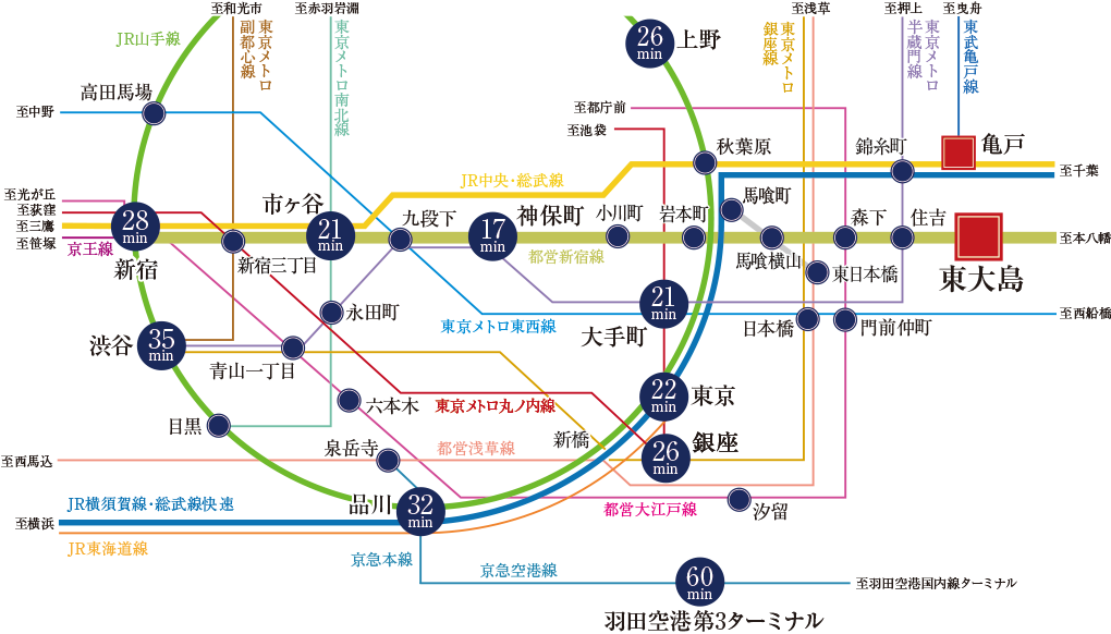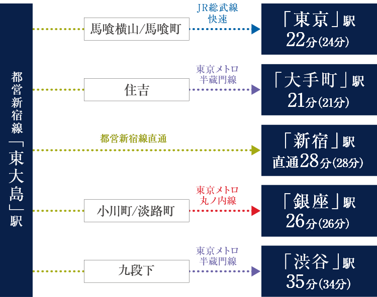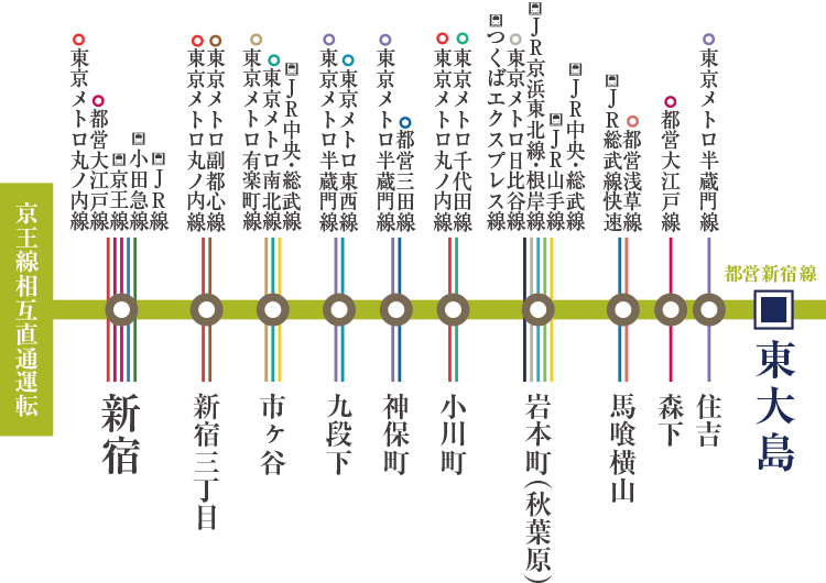 「東大島」駅から「新宿」駅間で多くの路線へ乗り換えが可能な都営新宿線。都心へのダイレクトアクセスはもちろん、多方面へのアクセスを可能にし、東京を自在に行き交うフットワークを可能にします。