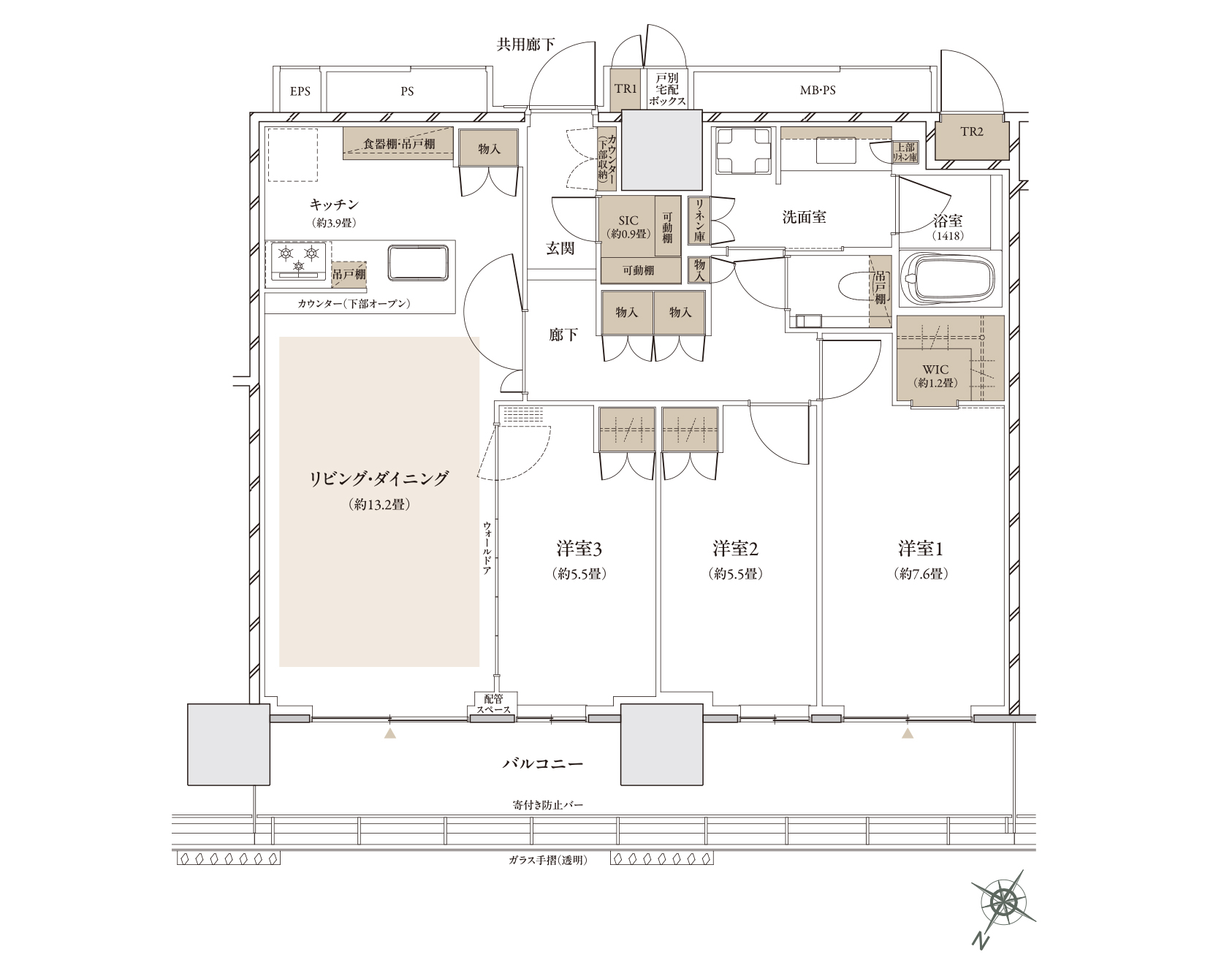 WIC:ウォークインクローゼット SIC:シューズインクローゼット TR:トランクルーム