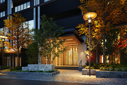 樹木の合間から見える大きな庇と、連続する縦スリット照明が優美にお出迎えするエントランス。