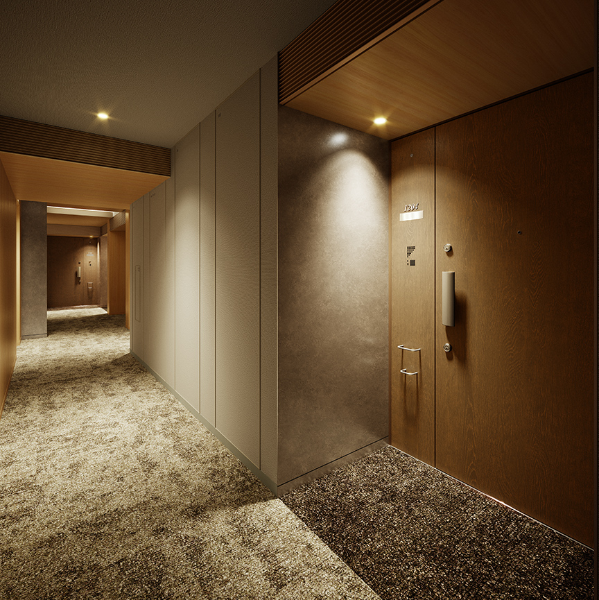 大判の石調タイル、陽光に輝くガラス素材、光沢のある金色化粧格子をはじめ、気品漂うマテリアルを数多く採用。基壇部では重厚感のあるものを中心に、上層に向かうにつれて伸びやかな印象を与えるものを用いるなど、質感が異なる素材を組み合わせながら「山下町」エリアに相応しい佇まいを形づくりました。レトロな雰囲気を感じさせながら都会的な洗練さも伺わせる、「山下町」での暮らしを象徴するかのような新旧が融和した邸宅を追い求めました。