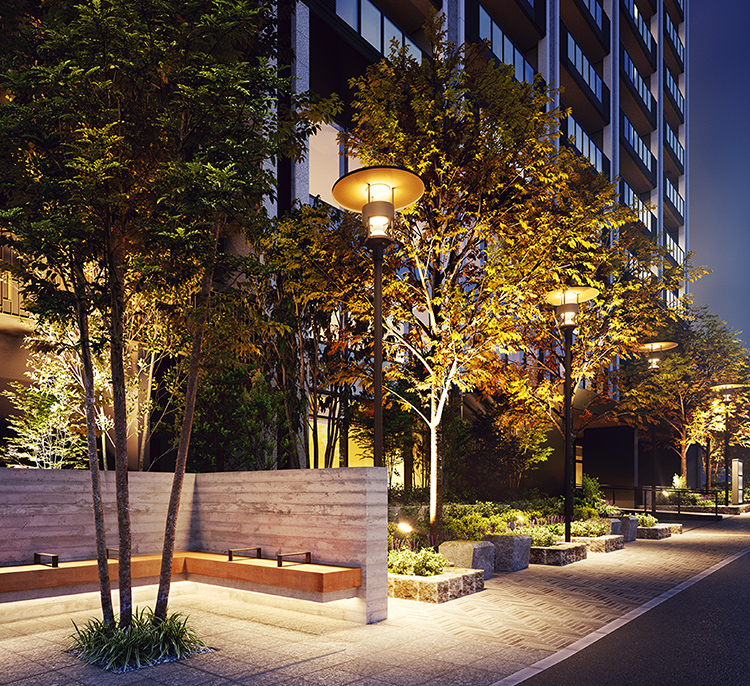 アプローチには豊かな緑と並木、石の縁石、ガス燈をモチーフとした外灯など、「山下町」らしさを形づくる沿道風景を描き出しています。