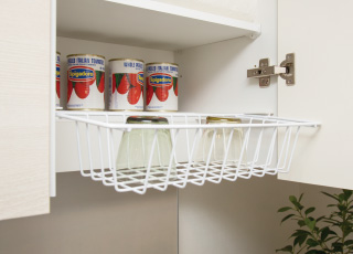 キッチンの吊戸棚には洗った食器を乾かすのに便利な水切りカゴを採用しています。