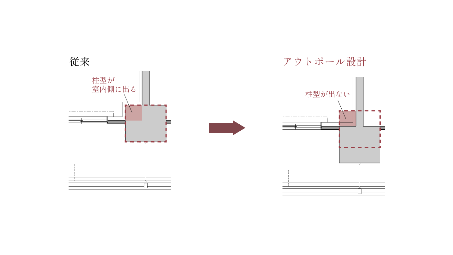 居室のデッドスペースを最小限に抑えたアウトポール設計。