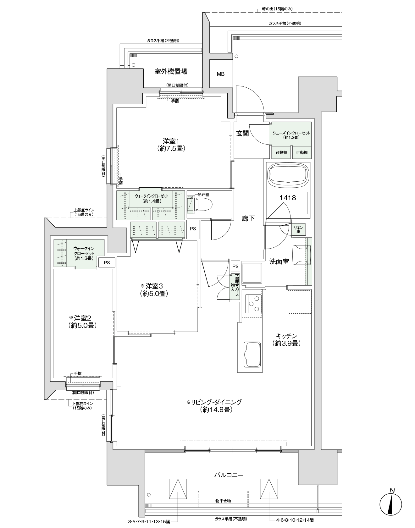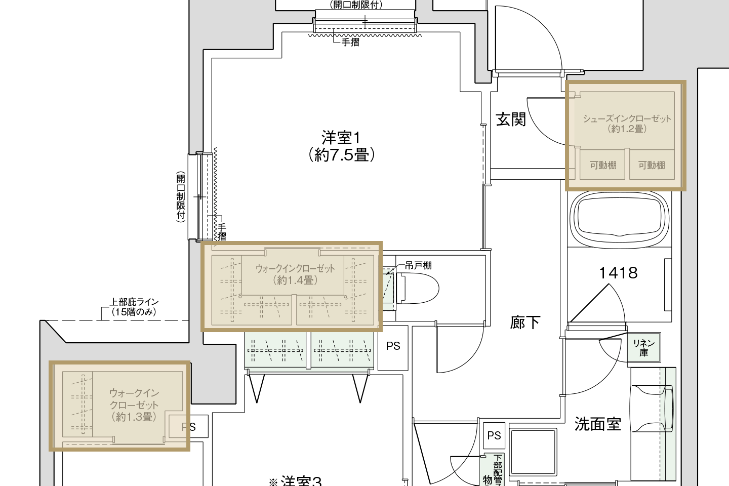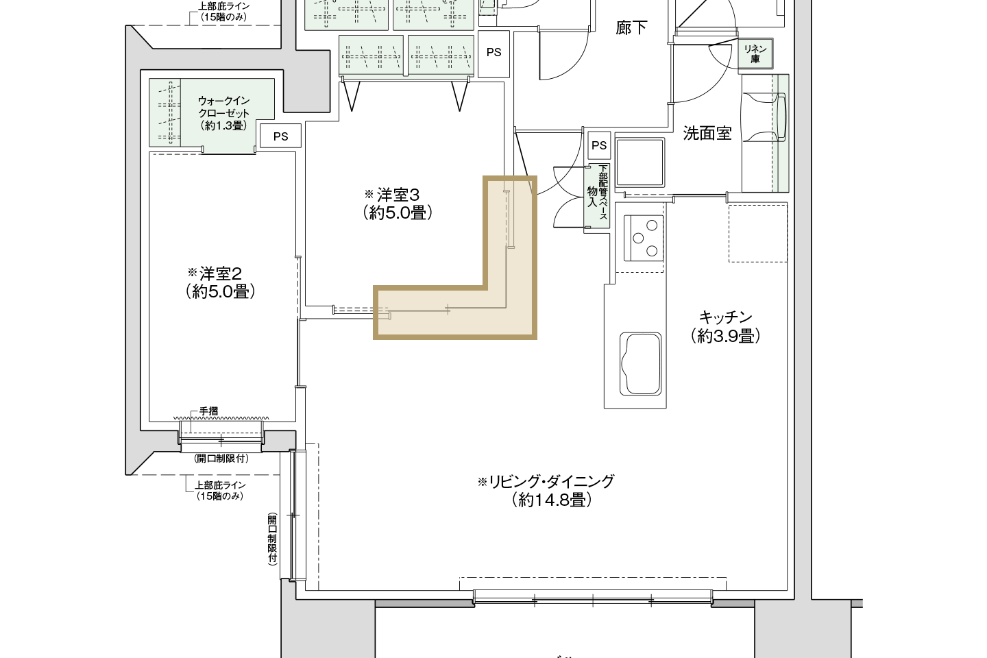 ※2~6階「リビング・ダイニング」・「洋室3」は、建築基準法上の居室の要件を満たすために、床面すべてにおいて、50ルクス以上の照度を確保できる照明器具の設置が必要です。
