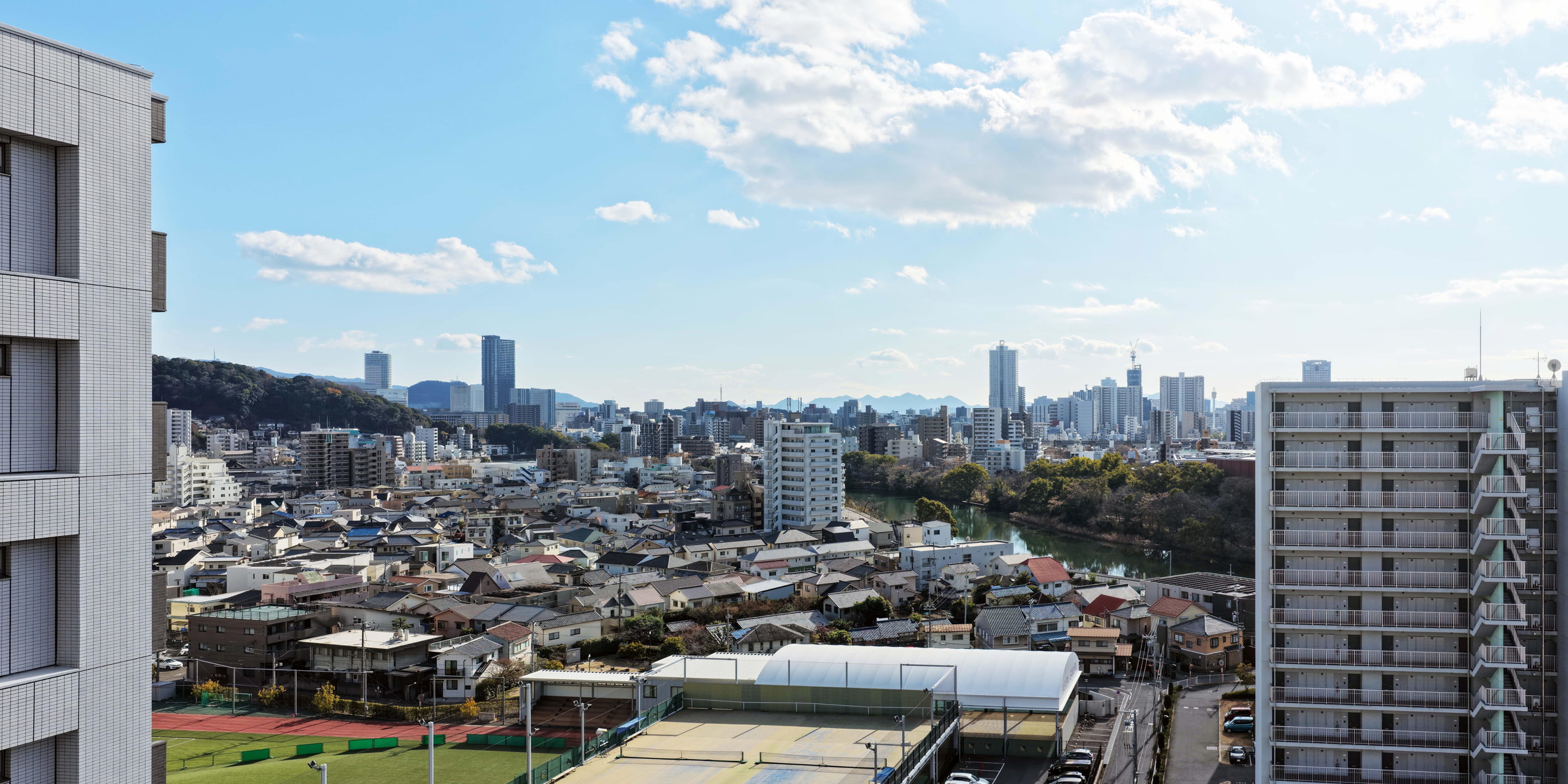 京橋川や河畔の桜並木、二葉山の緑をリビングの窓越しに望むことができます。
